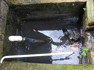 Electric pump with a submersible float switch – a pressurised rising line is laid to a convenient drainage point.